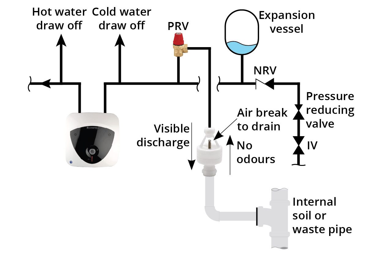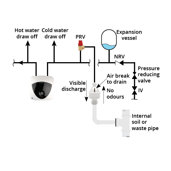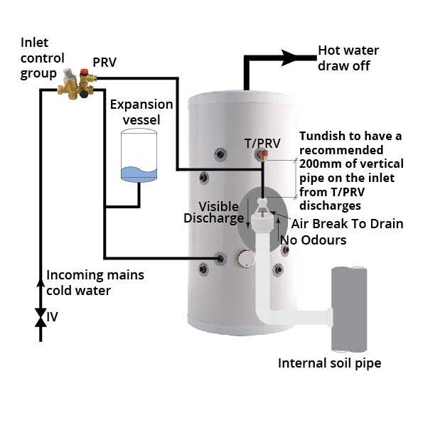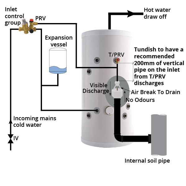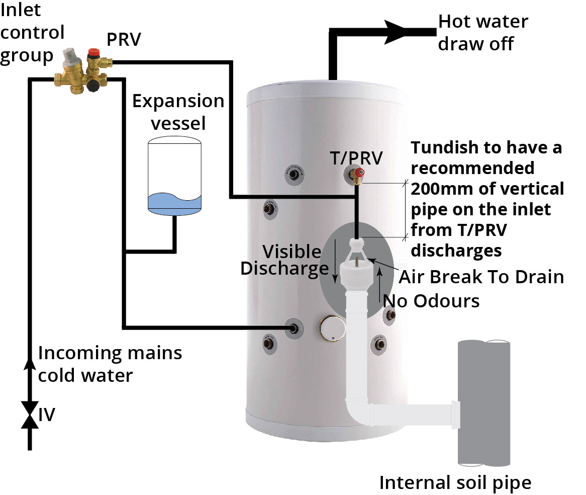 Please note that, where required, the D2 and connecting soil pipe must be suitably rated for the appropriate temperatures and flow rates expected when the Temperature Relief Valve (TRV) is operating under failure conditions.